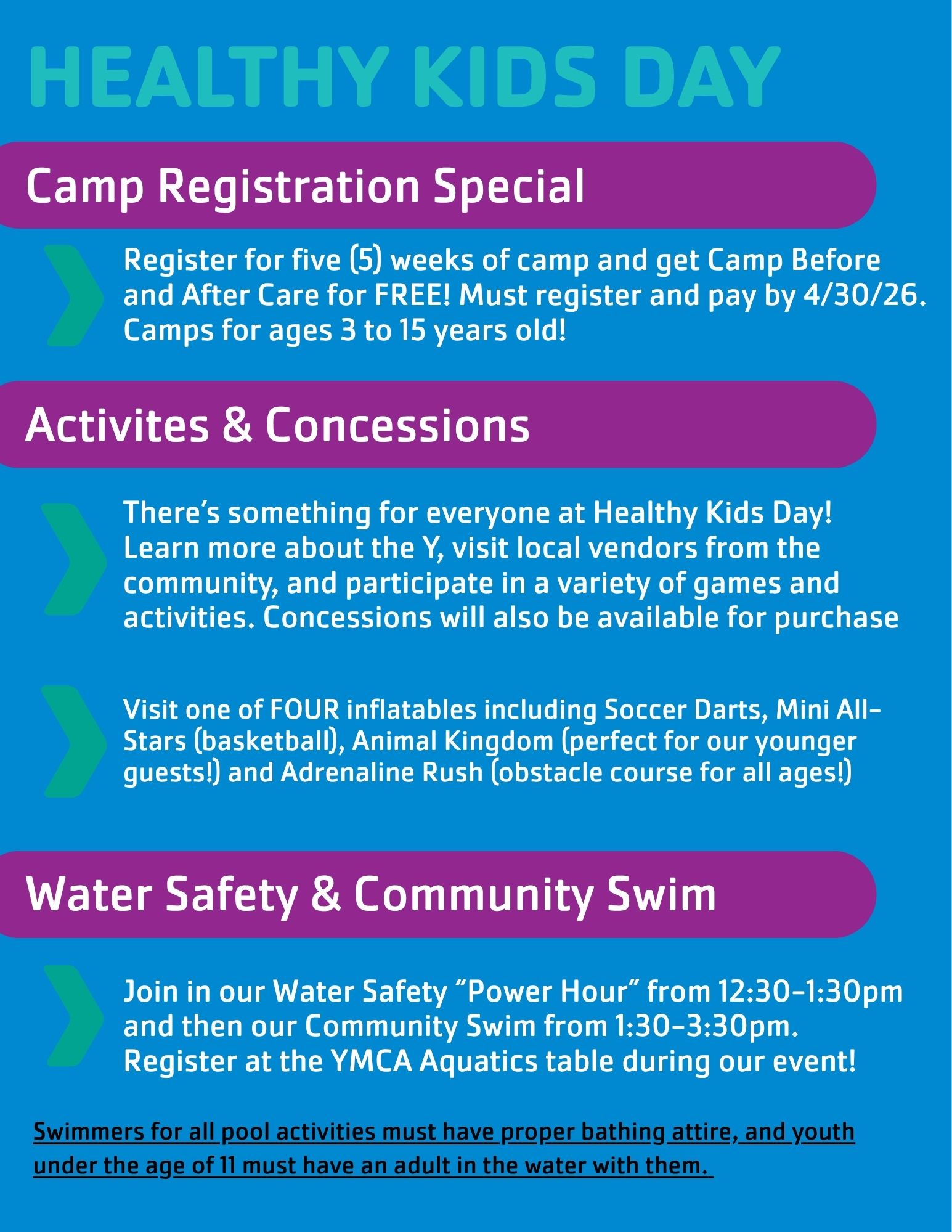 Join us from 10am-12pm at the YMCA for our annual FREE community event! Games, inflatables, resource tables and more - stop by! And don't forget about our Water Safety "POWER HOUR" and Community Swim, beginning at 12:30pm.